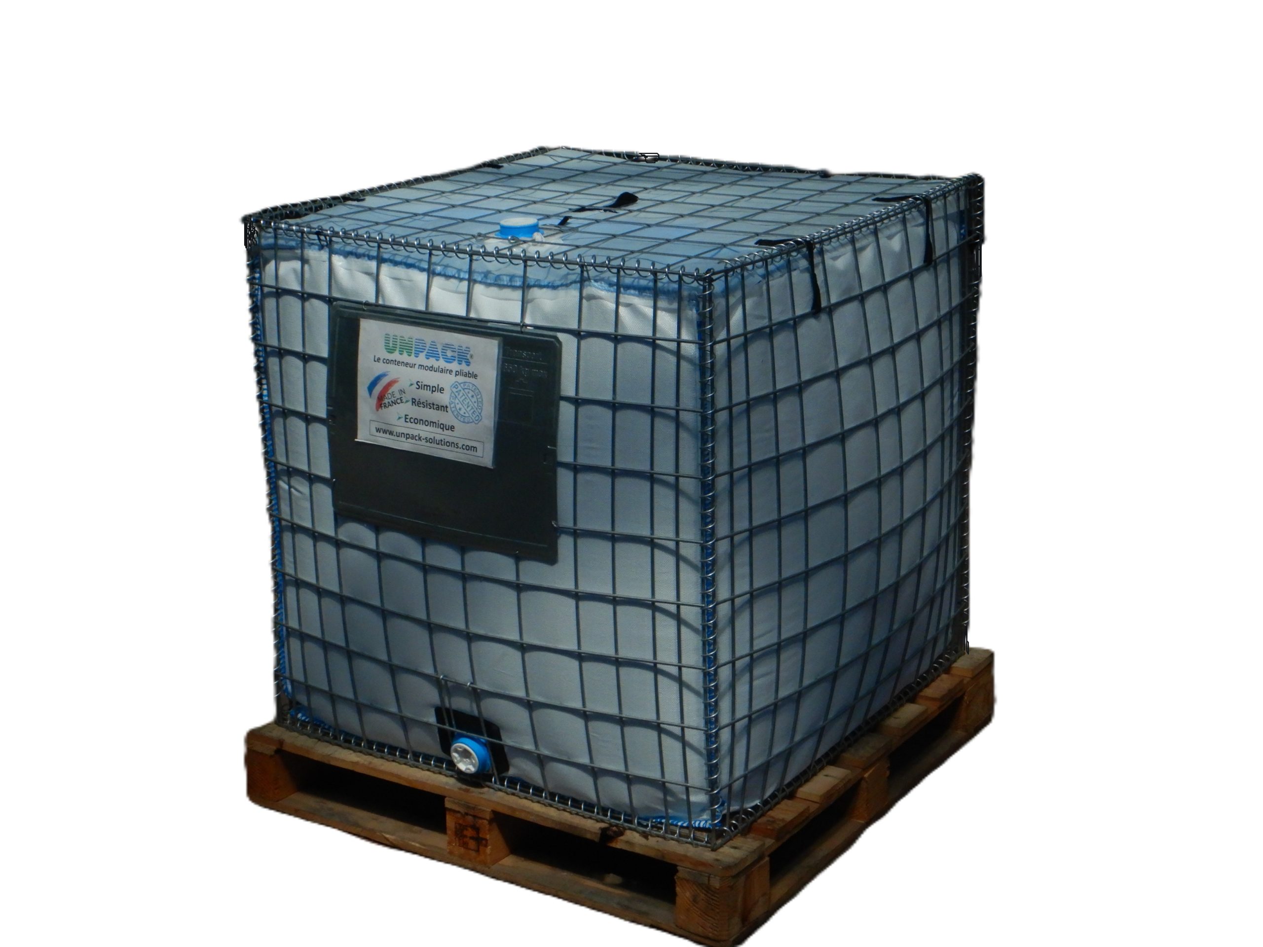 L’emballage breveté se place en sécurité sur des palettes CP3 ou CP9 de premier réemploi. Ces palettes recyclées sont en bois ou plastique ce qui limite doublement l’impact économique et l’empreinte carbone donc la valeur de l’écotaxe. Leurs fournitures est une option et par lot de 20 unités associées au 20 kit de conteneurs Emballage Bag in Box 1000l. écoconçu et pliable.